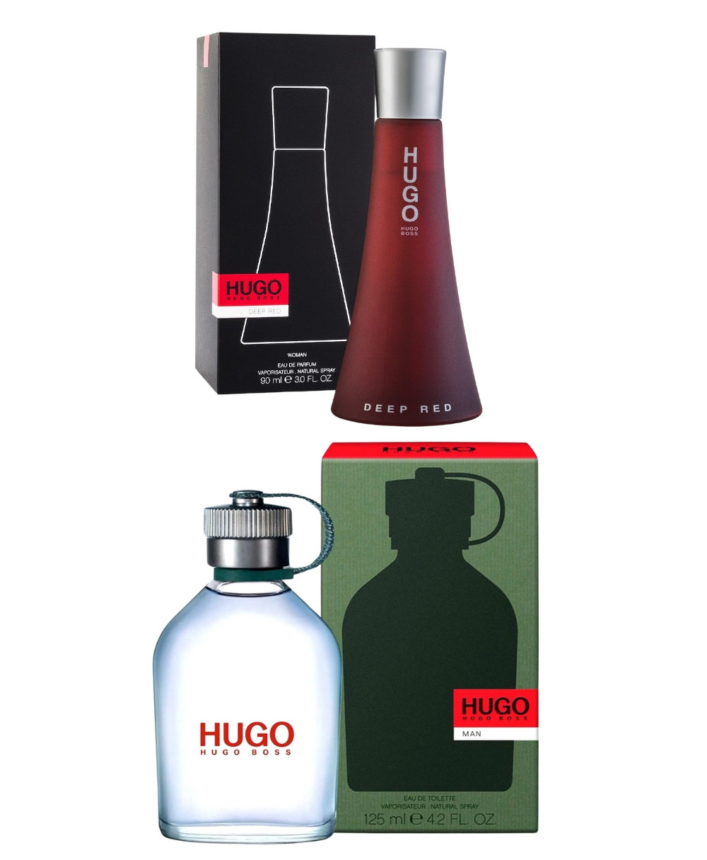 1) Hugo Boss Green 125ml Eau de Toilette Caballero es una fragancia de la familia olfativa Aromática Verde para Hombres. Las Notas de Salida son manzana verde, lavanda, menta, toronja (pomelo) y albahaca; las Notas de Corazón son salvia, geranio, clavel y jazmín; las Notas de Fondo son abeto, cedro y pachulí. 2) Hugo Boss Deep Red 90ml Eau de Parfum Dama es una fragancia de la familia olfativa Oriental Vainilla para Mujeres. Las Notas de Salida son naranja sanguina, grosellas negras, clementina, mandarina y pera; las Notas de Corazón son jengibre, flor de jengibre, nardos, fresia y semillas de hibisco; las Notas de Fondo son vainilla, sándalo, almizcle y cedro de California.