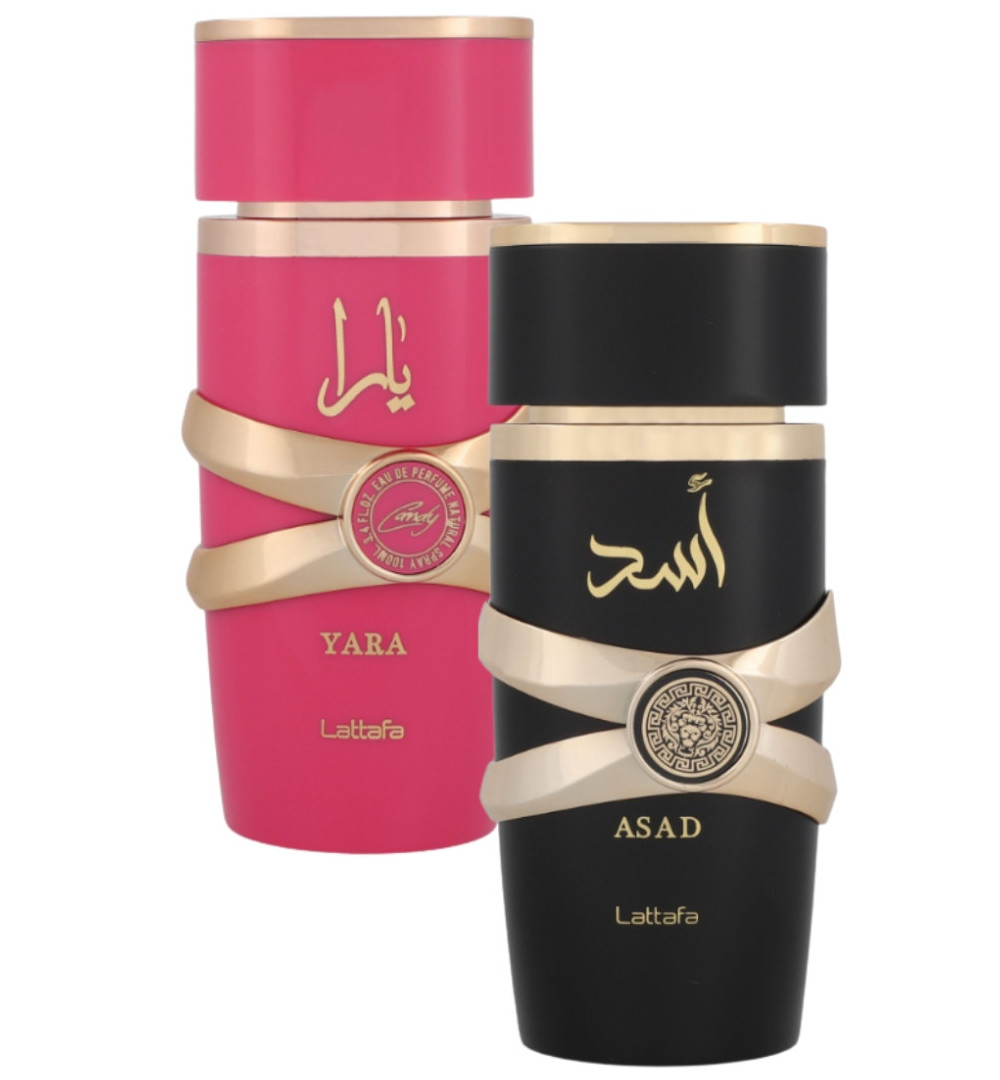 1) Lattafa Yara Candy 100ml Eau de Parfum Dama es una fragancia de la familia olfativa Floral Frutal Gourmand para Mujeres. Las Notas de Salida son grosellas negras y Mandarina verde; las Notas de Corazón son Strawberry Fizz Candy y gardenia; las Notas de Fondo son vainilla, almizcle, ámbar y sándalo. 2) Lattafa Asad 100ml Eau de Parfum Caballero es una fragancia de la familia olfativa Oriental para Hombres. Las Notas de Salida son pimienta negra, tabaco y piña; las Notas de Corazón son pachulí, café y iris; las Notas de Fondo son vainilla, ámbar, Madera seca, benjuí y ládano.